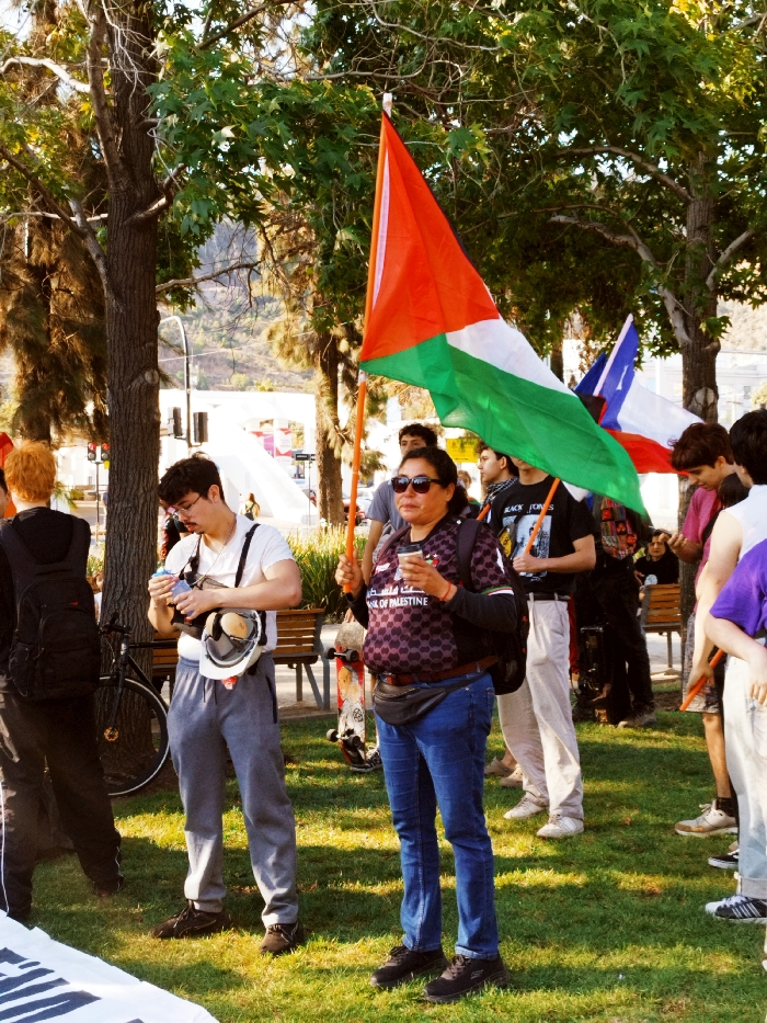A group of people are standing in a park, holding flags and signs. The flags include the Palestinian flag, and a Chilean flag can be seen in the background. Some of the people are holding skateboards, and one woman has a drink in her hand. A man with glasses is putting on a hardhat. They appear to be at some type of demonstration or rally.