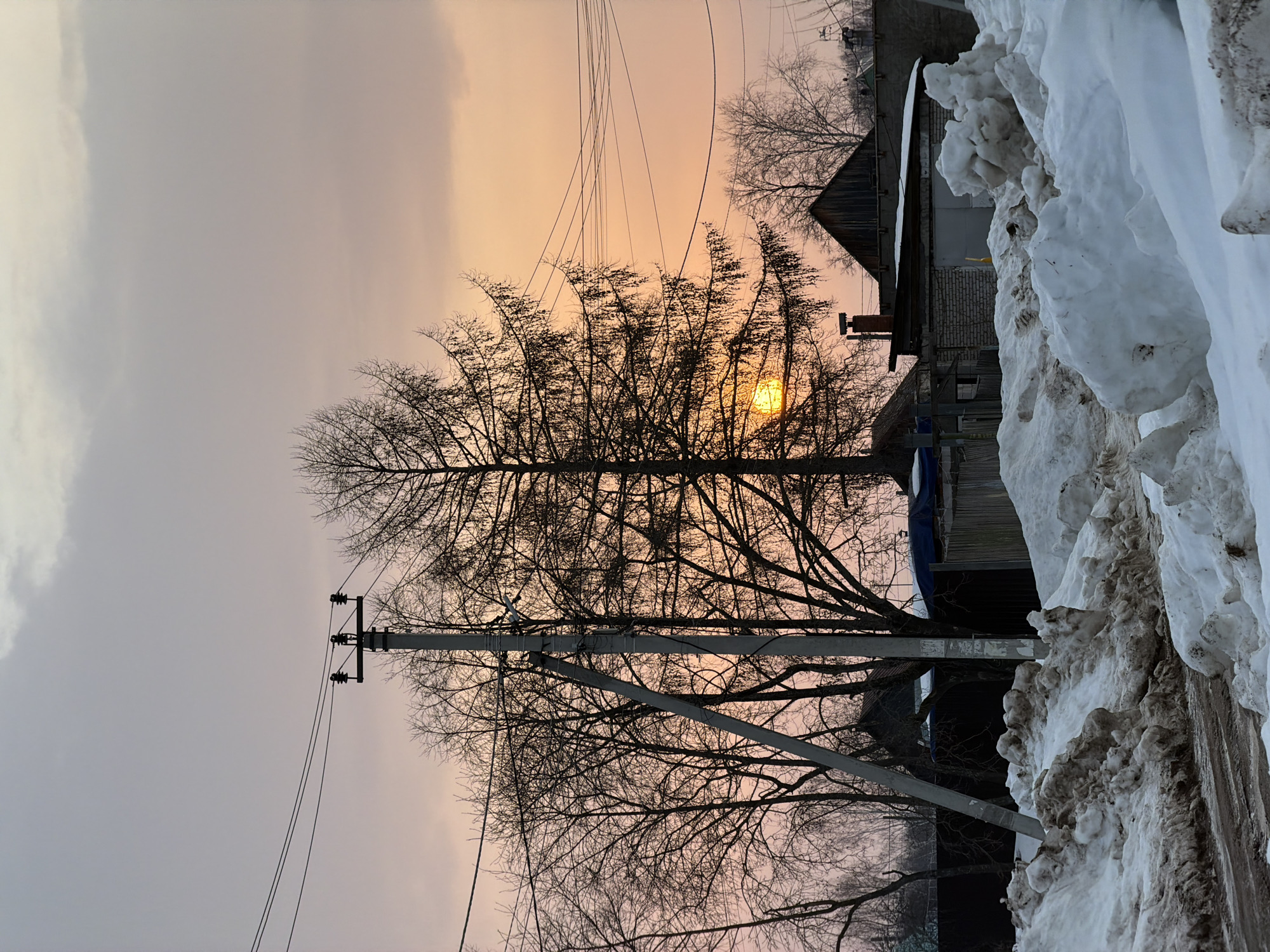 The image depicts a winter street scene at either sunrise or sunset in Chaikovsky, Russia. The sky presents a gradient of color, transitioning from a prominent orange-pink hue near the horizon to a lighter grey-pink overhead, with scattered clouds. A bright, circular, orange-yellow sun is visible in the mid-right, partially obscured by the dense branches of a coniferous tree, which is silhouetted against the sky. In the foreground, large, irregular mounds of dirty snow and ice line what appears to be an unpaved road or path. This road surface shows traces of snow, mud, and dirt. Two utility poles are prominent in the midground: a tall, slender grey pole equipped with three insulators and multiple overhead electrical wires, and to its left, a more massive grey pole reinforced by a diagonal brace. The background features numerous bare deciduous trees and the aforementioned coniferous tree, all creating dark silhouettes against the colored sky. Behind these trees, several low-rise structures are visible, appearing to be residential or auxiliary buildings with dark, sloped roofs. One building displays a brick chimney. Fences are also discernible in the distant background. No individuals, animals, or vehicles are present within the frame.