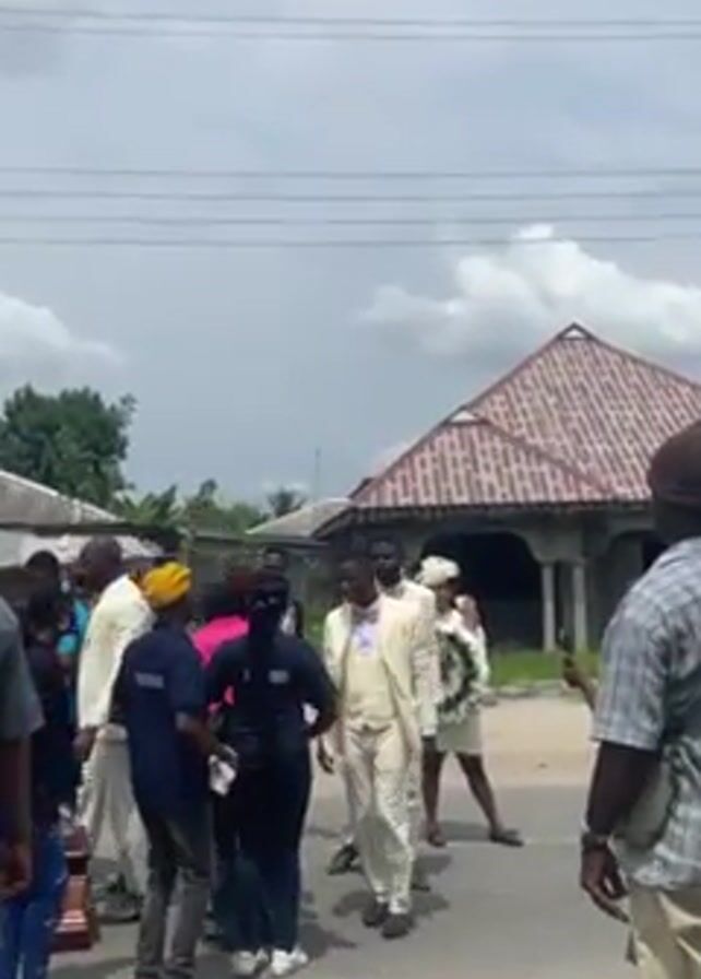 group of people walking down a street on a cloudy day. Many of the people are wearing white suits. Several people are carrying a brown casket, while others take photos or watch. The street is lined with buildings and trees.