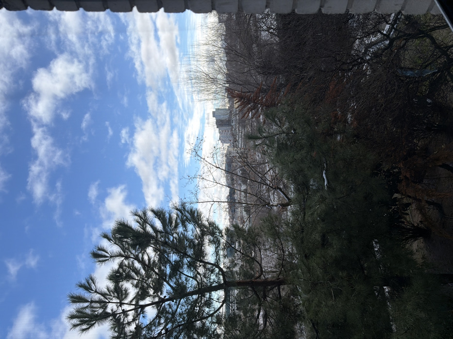 The image depicts a panoramic view of a snow-covered urban landscape in Madrid, Spain, likely captured during the Storm Filomena event in January 2021. The scene is observed from an elevated perspective, presumably from a window or balcony, evidenced by a partial brick wall visible on the right frame edge. The sky is bright blue with scattered white cumulus clouds. In the foreground and mid-ground, a dense, snow-dusted green space is visible, resembling an urban park or wooded area. A large, dark green pine tree with visible cones dominates the left side of the frame. Numerous other trees, primarily bare deciduous types with thin branches, are interspersed throughout the snow-covered terrain, showing light patches of snow on their branches and trunks. Evergreen shrubs and ground cover are also lightly coated in snow. In the background, a metropolitan skyline stretches across the horizon, consisting of numerous multi-story residential buildings and apartment blocks. These structures vary in height and density, indicating a populated urban or suburban district. No specific iconic landmarks are discernible to pinpoint an exact neighborhood, but the overall architecture is consistent with modern residential developments found throughout Madrid. There are no individuals or discernible actions in the scene. The environment is characterized by winter conditions with clear weather.