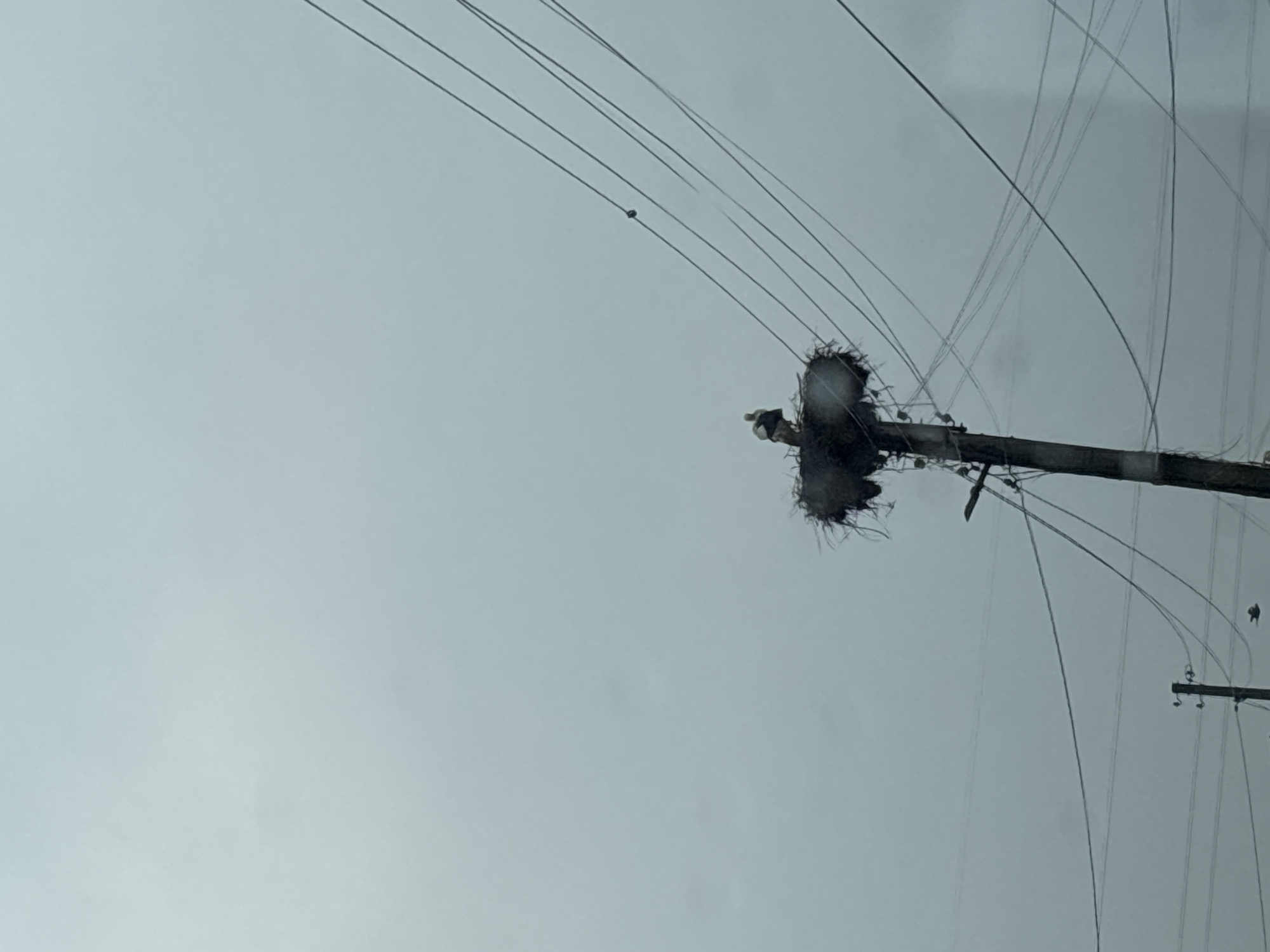 In Ruptsi, Bulgaria, an outdoor scene is captured under a uniformly overcast, light grey sky. A substantial, roughly circular bird's nest, constructed from intertwined sticks and organic debris, is positioned atop a tall, weathered wooden utility pole located slightly right of the image's vertical center. A single large bird, identified as a stork, stands within the nest, its back partially oriented towards the viewer, revealing predominantly white plumage with dark primary wing feathers. Multiple dark-colored utility wires extend diagonally upwards from the upper right, passing above and adjacent to the nest. Additional wires are attached to the main utility pole below the nest, traversing horizontally and diagonally across the mid-ground. A street light fixture is affixed to the main pole, beneath the nest structure. A smaller, darker wooden utility pole, also equipped with wires, is visible in the lower left background. A small, dark bird is captured in flight in the lower left quadrant, and a small, dark object rests on one of the upper diagonal wires. No human individuals are present.
