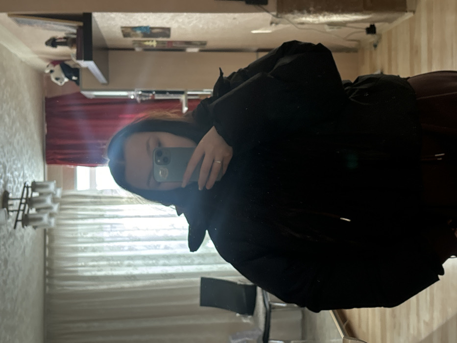The image displays a full-body mirror selfie of an individual, likely female, with long dark hair, wearing a black puffer jacket and dark pants