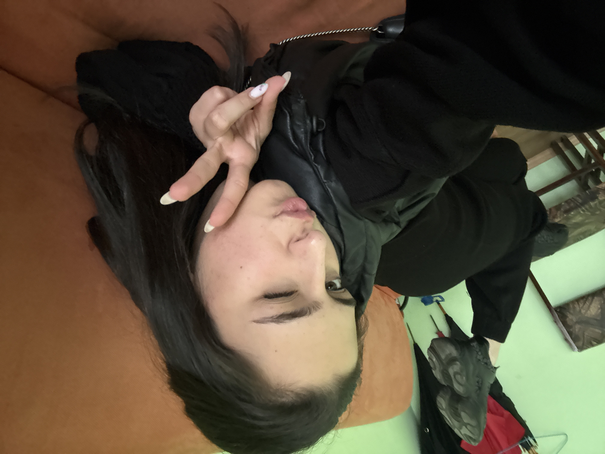 An indoor scene, situated in Vratsa, Bulgaria, depicts a young female lying prone on an orange-brown upholstered surface, consistent with a sofa or bed. The subject has long, dark hair and is dressed in a black puffer jacket over a black long-sleeved garment and black pants. Her left leg is bent at the knee, revealing a dark, chunky sneaker on her left foot. Her face is directed towards the camera, with her left eye winked and lips pursed in a kissing gesture. Her right hand is raised, displaying a peace sign with extended index and middle fingers. Her fingernails are long, almond-shaped, with white tips and a subtle decorative element on the right thumbnail. The background features a light green wall. On the upper left, a clothing rack with several garments, including a visible red item, is present. A wooden chair with a patterned seat is partially visible below the rack. The lighting is ambient and consistent with an interior setting.