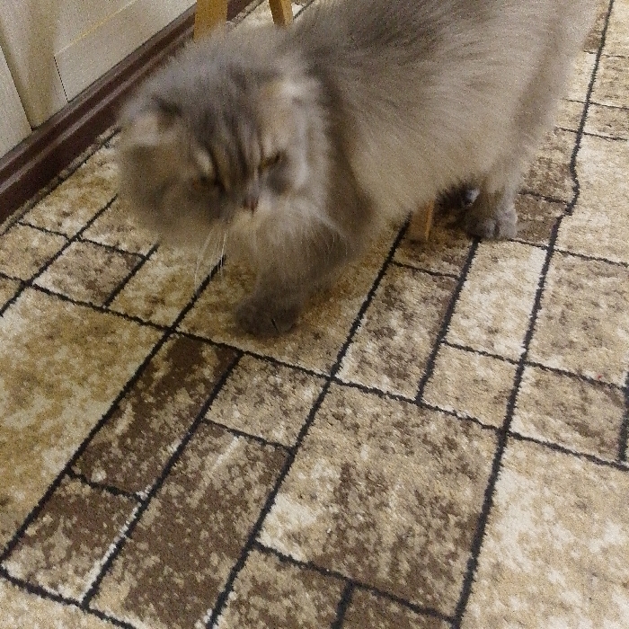 - "A fluffy, gray cat walks on a tan and brown patterned carpet" by FM-o4pOG2, licensed under CC BY 4.0