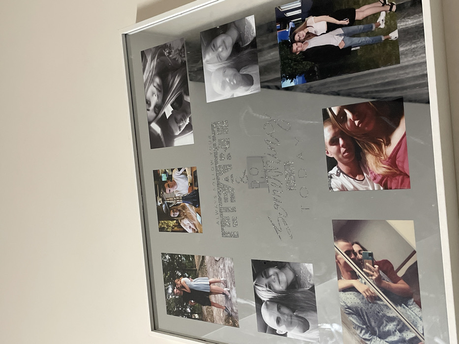 The image displays a white-framed picture collage presented against a plain, light-colored wall, angled upwards from the bottom-left. The frame contains a light grey matte board with eight photographs and glitter text applied to its surface. The text reads, "ALWAYS FOLLOW YOUR HEART & DO SOMETHING TODAY". The photographs depict primarily a young adult male and female in various settings and interactions: * **Top-left:** A male in a dark shirt embraces a female in a light blue dress outdoors, with trees visible in the background. * **Top-middle:** The same male, wearing a white long-sleeved shirt, and female, wearing glasses, are seated indoors at a table with a dark-colored hookah. * **Top-right:** A black and white close-up portrait shows a female looking directly forward, with a male's face partially visible below her. * **Middle-left:** A black and white portrait features a male with a shaved head and a female with long hair, both looking forward. * **Middle-right:** Another black and white portrait shows the same male and female, with the female winking. * **Bottom-left (left-most):** A male is shown in a reflection, holding a smartphone to take a selfie. * **Bottom-left (right-most):** A color portrait depicts the male, wearing a white top, leaning his head towards the female, who is wearing a pink top. * **Bottom-right:** The male, wearing a dark jacket and jeans, stands next to the female, wearing a white crop top and black skirt, in an outdoor setting with buildings and greenery in the background. The subjects' actions include posing for portraits, embracing, and engaging in leisure activities. The environments within the individual photographs range from natural outdoor settings to indoor social venues. The specific location of this framed collage within the city of Sofia, Bulgaria, cannot be determined from the visual information provided.
