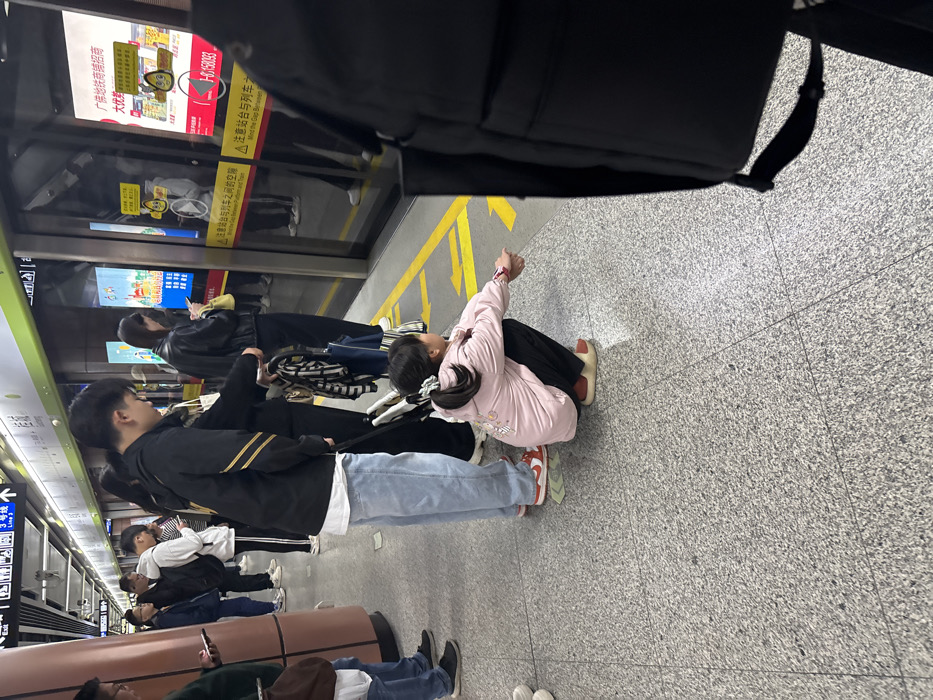 The image depicts a subway platform with a group of people waiting. Several individuals are seated on the ground, while others are standing. A girl in a pink jacket sits huddled near yellow directional lines, with a man in jeans and a black jacket standing next to her. A subway car is visible in the background, with advertisements displayed on its windows. The overall atmosphere suggests a crowded public transportation setting.