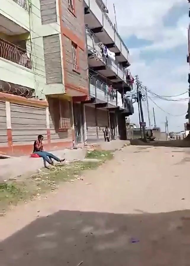 A person sits on a low concrete wall next to a street. The street is unpaved with dirt and debris. Tall buildings line the street. A small red car is parked next to a fence. A person stands near the car next to blue barrels. Laundry hangs from balconies on the buildings. Power lines run overhead.