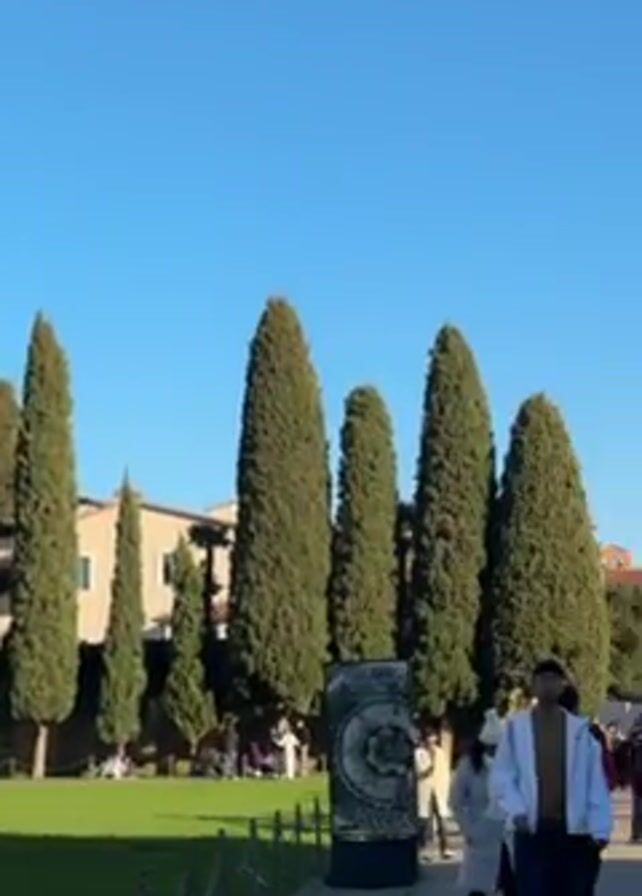 Leaning Tower of Pisa in Pisa, Italy on a sunny day. The video pans from a grassy park with tall trees to a street with a crowd of people. The camera moves up to reveal the Leaning Tower of Pisa with people standing around it.