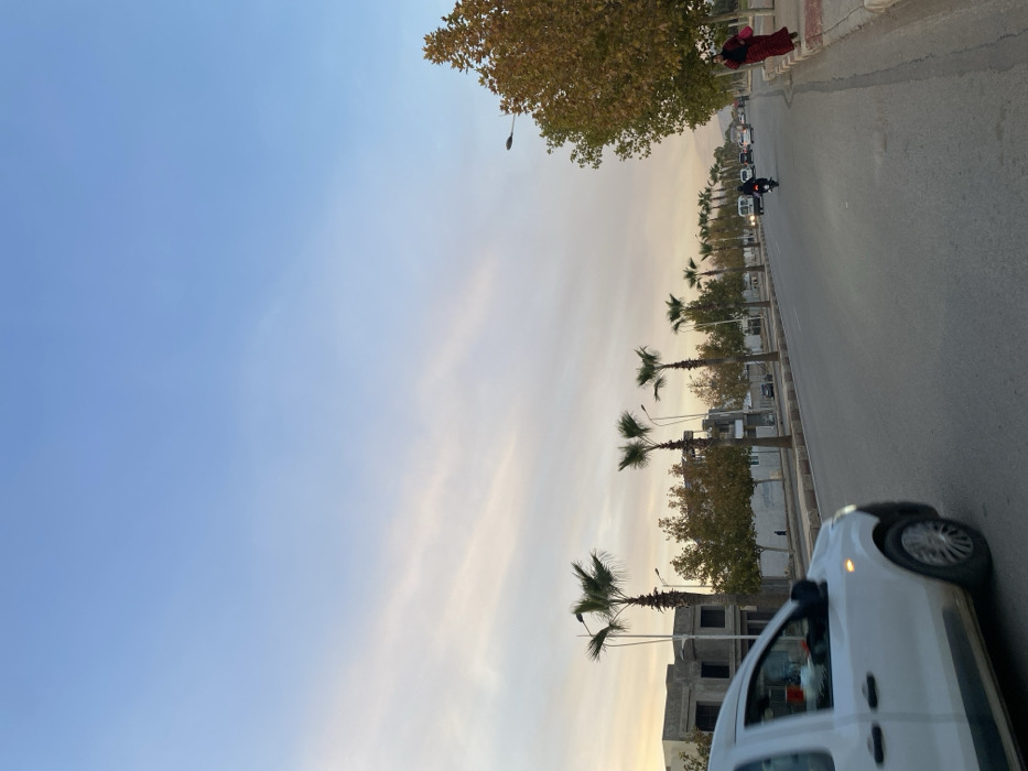 An angled view of a street lined with trees, including palms, under a light blue sky with streaky clouds. A white van occupies the lower right, partially obscuring the buildings. Further down the road, there are cars and a motorcycle. A person in dark clothing and a red headscarf walks on the far side of the street. The perspective is slightly tilted, giving an unconventional composition.
