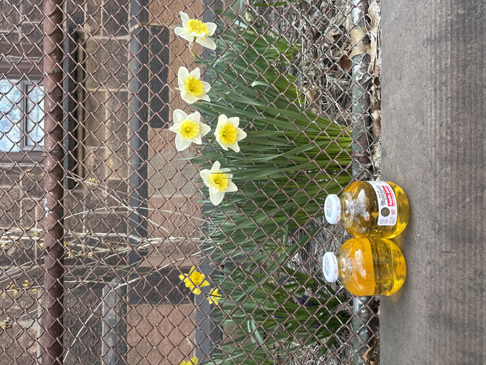 The image captures a scene outdoors, adjacent to a weathered chain-link fence. On the left side of the frame, the fence reveals a building, possibly made of brown brick, with at least one window visible. On the right, near the fence, lies a section of grey concrete, suggesting a sidewalk or pavement. Nestled within the greenery along the fence line are blooming daffodils, displaying a mix of white and yellow petals. Two bottles of Martinelli's Gold Apple Juice rest on the concrete near the flowers, their labels and caps partially visible.