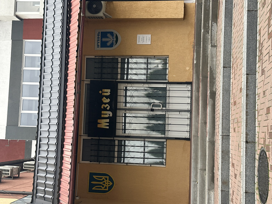 The image depicts the Irpin Historical and Local Lore Museum in Irpin, Ukraine, viewed from a slightly low angle