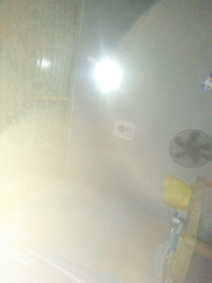A bright light dominates the center of the room, obscuring details. A ceiling fan with visible blades sits in the upper right. A yellow object, possibly a bucket, hangs nearby. A wall sticker is visible between the light and fan. A metallic wall or door is on the left. The image is heavily overexposed and blurred, making details difficult to discern.
