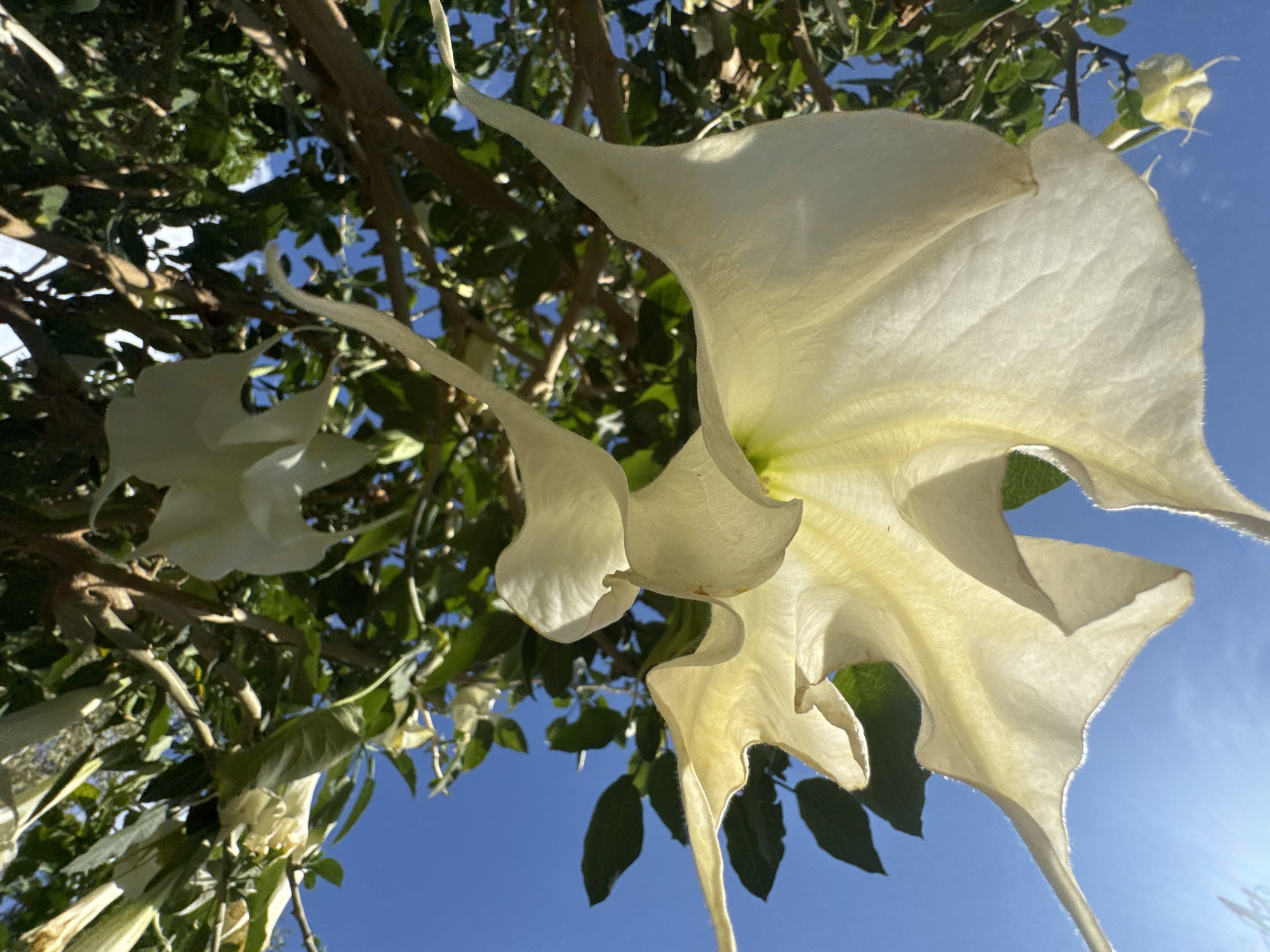 - "The image depicts large, white Datura flowers against a blue sky and green foliage" by FM-NVhht2, licensed under CC BY 4.0