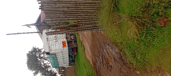 The image depicts an outdoor scene in Unknown, Kenya. A white cargo truck, partially covered by a green tarp, is positioned on a muddy, unpaved dirt road with visible tire tracks and standing water. The truck's rear features red and yellow reflective markings and mud flaps, one displaying the number "4." Green grass covers the ground surrounding the road. In the upper left background, a large tree with dense foliage is visible. To the right, a vertical fence-like structure constructed from numerous thin, light-colored wooden poles stands prominently. Behind this fence, in the upper center-right, a building with a dark-colored roof and stone or brick walls is partially visible. A flagpole extends from or near this building, flying a flag that appears to be the Kenyan national flag. To the mid-left, beyond the truck, a low, unfinished brick wall is present. No individuals are visible in the frame, and no discernible actions or interactions are occurring. The environment suggests a semi-rural or peri-urban setting.