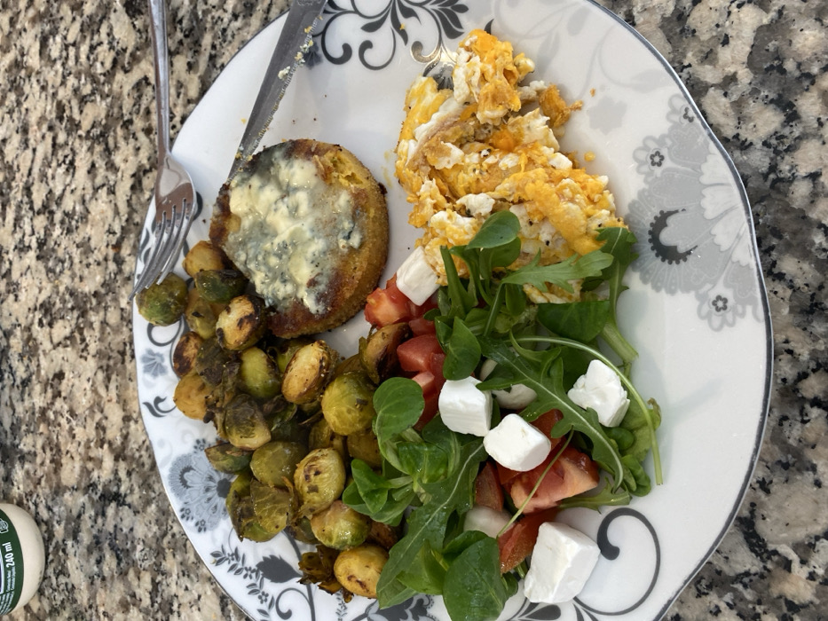 A high-angle, close-up photograph depicts a meal served on a white dinner plate with a grey floral rim design, positioned on a speckled brown and grey granite countertop. The plate contains four distinct food components: a pile of roasted Brussels sprouts occupying the upper left quadrant; a round, breaded item topped with crumbled blue cheese in the upper right, against which a silver-colored serrated knife rests, indicating a recent cut; a mixed green salad in the lower left, composed of leafy greens (likely arugula), diced red tomatoes, and multiple cuboid pieces of white feta cheese; and a portion of yellow and white scrambled eggs in the lower right. A silver-colored metal fork is visible above the Brussels sprouts and the breaded item. In the upper left background, a portion of a white container with green text and "240 ml" is visible. The specific location within the city of Gijón/Xixón, Spain, cannot be determined from the visual information provided.
