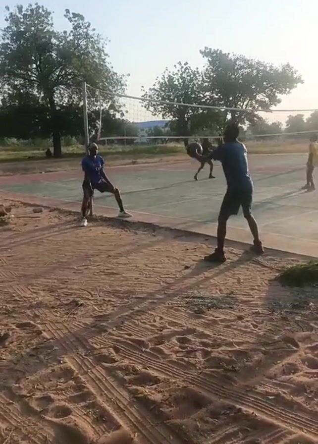 - "Several young people are playing volleyball on a worn tennis court" by FM-5D8LB2, licensed under CC BY 4.0