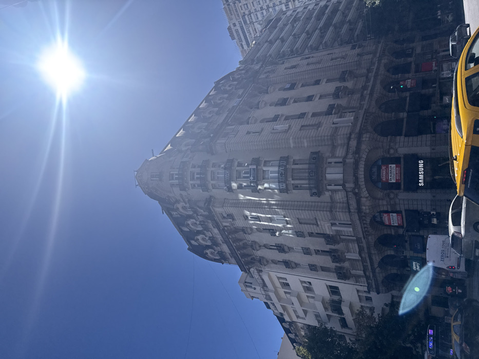 This image depicts a street scene at the intersection of Avenida Santa Fe and Callao in the Recoleta neighborhood of Buenos Aires, Argentina. The primary subject is a multi-story, ornate historic building with a light-colored facade, a rounded corner featuring stacked bay windows, and a dark mansard roof with dormers. The building's ground floor houses a prominent "SAMSUNG" store at the corner, flanked by commercial spaces displaying multiple "M&M ARAÑAFE EN ALQUILER" (For Rent) signs in their arched windows. Sunlight casts distinct vertical reflections on the windows of the building's left facade. To the immediate left, a modern, white residential building with balconies is visible. Another tall, lighter-colored building is partially visible to the right and behind the main structure. The sky is a clear, bright blue, with a strong sun flare dominating the upper right quadrant, indicating intense sunlight. A distinct blue-green lens flare artifact is present in the lower-left foreground. The street level, partially visible in the foreground, shows the upper portions of several vehicles. These include a yellow taxi on the right, another partial yellow taxi on the far left, a white commercial van labeled "ZEROS SUMA" in the center-left, and other cars. A traffic light showing a green signal is visible near the center-right. Overhead wires stretch across the upper-left sky. No specific individuals or their actions are discernible in detail.