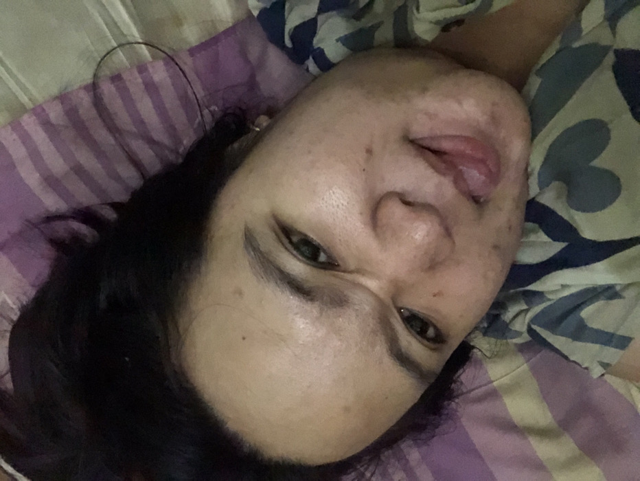 A person lies on a bed with a purple and white striped pillow and a patterned comforter. Their face is turned towards the camera, with their tongue sticking out playfully. They have dark hair, defined eyebrows, and brown eyes. Skin blemishes are visible. The overall impression is casual and relaxed.