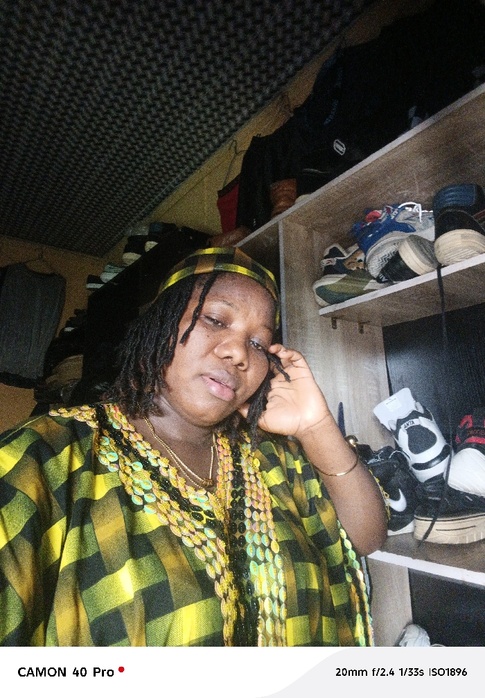 An individual with dark skin and dreadlocks, wearing a yellow and black plaid cap and a matching loose-fitting garment with extensive yellow, green, and black beadwork around the neckline, looks directly at the camera with a neutral expression. Multiple thin gold-colored necklaces are visible, along with a gold-colored bracelet on the left wrist. The individual's left hand is raised, with fingers near the temple. The background on the left features a dark, patterned ceiling or wall covering, with indistinct dark garments or objects below. The background on the right displays a light-colored wooden shelving unit containing various pairs of shoes, including sneakers and boots, some partially obscured. This scene takes place indoors, at the City of Unknown, Unknown.
