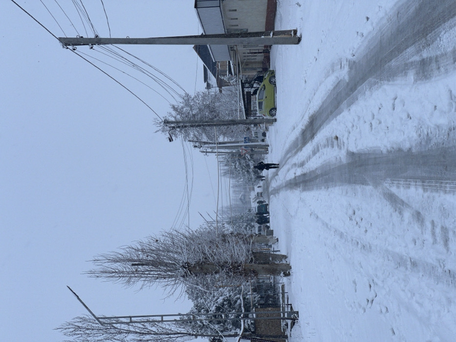 A snow-covered street is depicted. Bare trees line the left side, weighed down with snow. Power lines stretch across the sky. Tire tracks mark the road, with a pedestrian walking along the cleared path. A light green car is parked on the side of the road further down. Buildings can be seen in the background, veiled by the snowy weather. The sky is overcast, adding to the overall wintery ambiance.