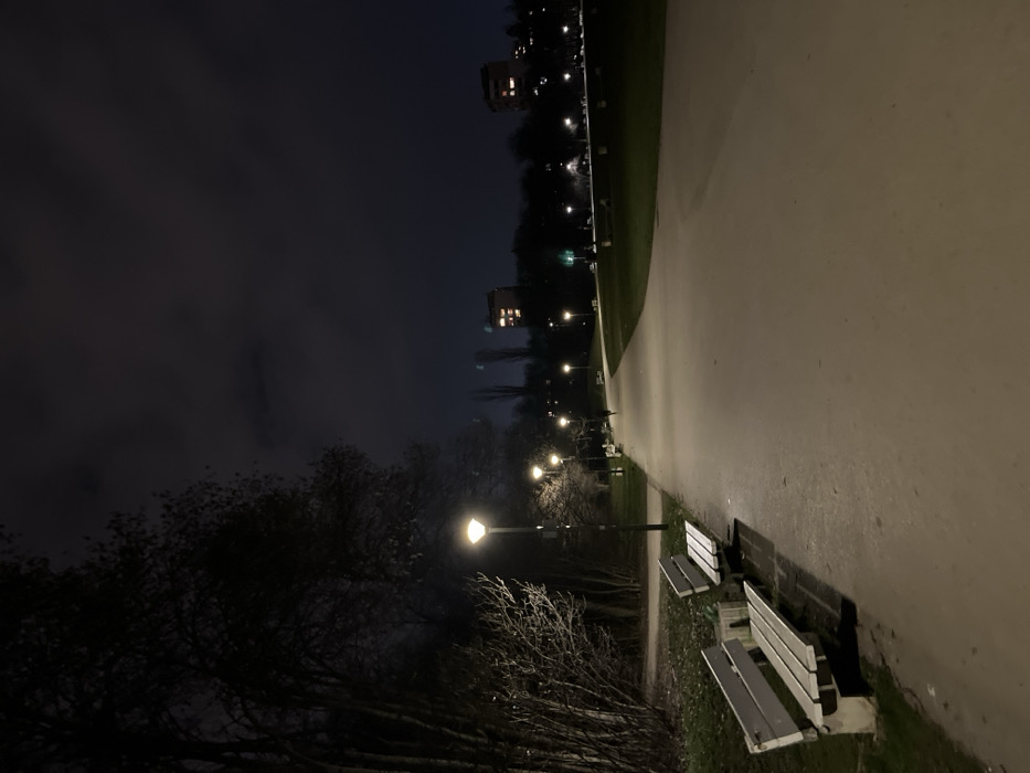 The image depicts a night scene within South Park, Sofia, Bulgaria. A wide, paved pathway extends from the foreground, curving gently to the right and ascending slightly into the distance. The path is illuminated by a series of vertical streetlights with upward-facing fixtures, casting light onto the ground and surrounding vegetation. In the immediate foreground on the left, two light-colored wooden park benches, each supported by concrete bases, are positioned parallel to the pathway. Adjacent to these benches, a dense line of deciduous trees and shrubs, mostly bare, borders the left side of the path. Further along the path, in the midground, a single human figure is observed walking away from the camera. To the right of the pathway, a sloping grassy area is visible. In the background, against a dark, cloudy night sky, the silhouettes of multiple multi-story residential buildings are discernible, with several windows exhibiting interior illumination. The sparse foliage on the trees suggests a late autumn or winter season.