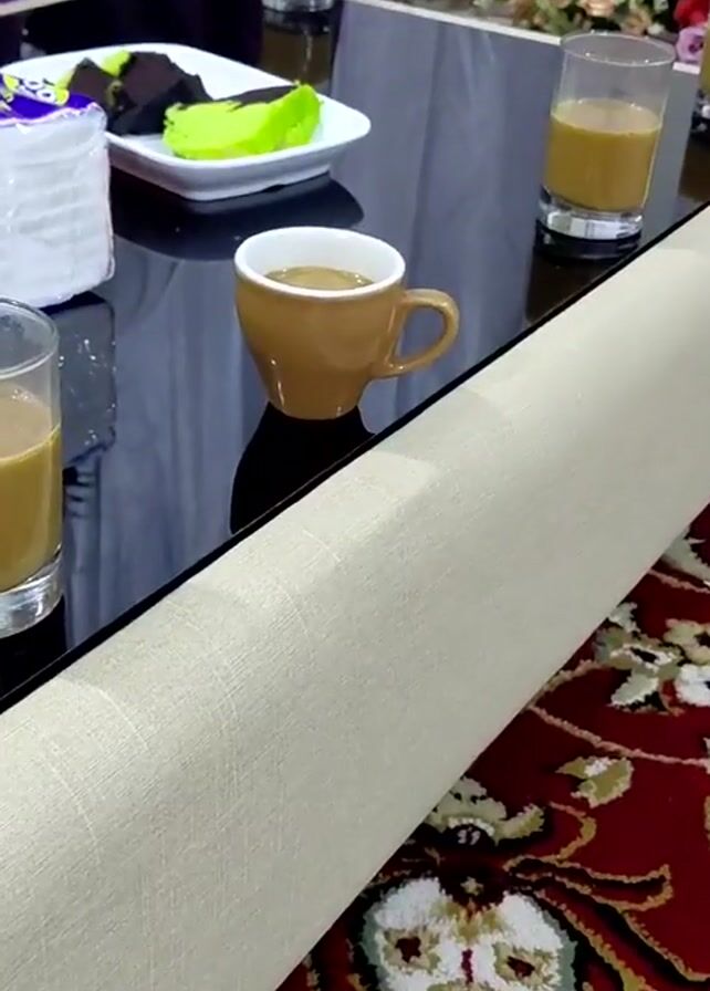 The video presents a close-up view of a low black table covered with several glasses and a small brown cup, each containing a tan liquid. A small white dish with black and green sliced sweets is also on the table, alongside a pack of yellow and purple napkins. Part of a person in a white shirt and patterned tie is visible in the background, with their hands occasionally entering the frame. A cream-colored sofa or couch runs along the lower right edge of the frame. Below the sofa is a red rug with a floral pattern. Behind the table are floral arrangements and a person is partially obscured behind a purple draped cloth. The surface of the black table is reflective.