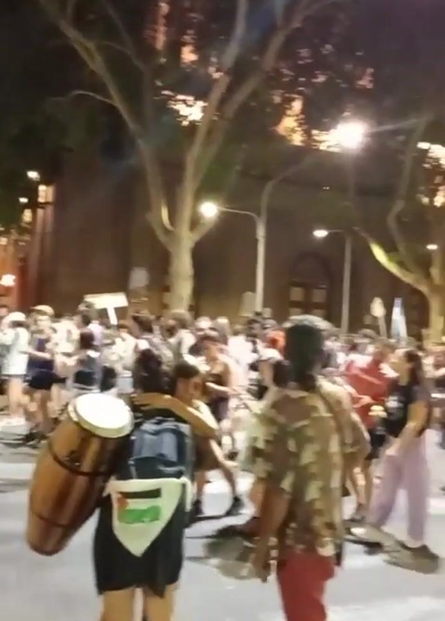 At night, a crowd of people are walking across a street. The street is lined with trees and streetlights, and a building can be seen in the background. Some people are carrying flags. One person is carrying a drum. Some people are looking at their phones. The crowd is diverse in age and dress. The video appears to have been taken from within the crowd.
