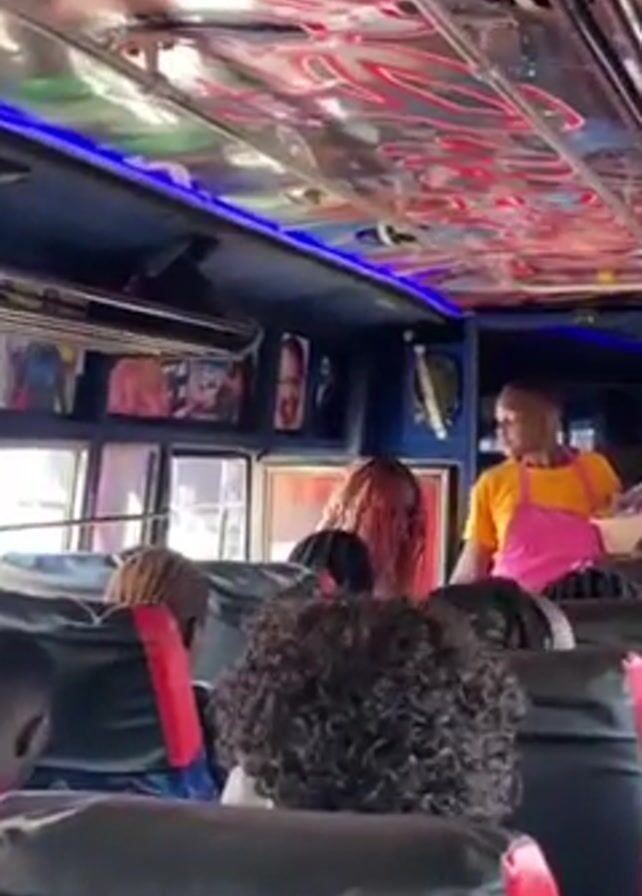 The inside of a bus in what looks like Africa is shown. A woman in a yellow shirt and pink purse is walking down the aisle of the bus, passing out packaged snacks to the passengers. Other passengers are visible in their seats. The bus ceiling has an elaborate design with red and black paint, chrome accents, and blue lighting.