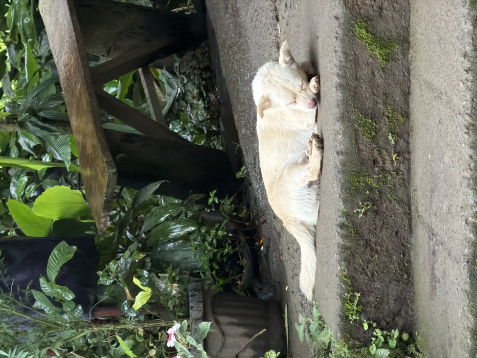 A cream-colored dog sleeps soundly on gray concrete steps. Its body is curled against the step's edge, paws tucked close. Moss grows on the steps near the dog. Lush green foliage, including large-leafed plants and vines, fills the background. A wooden structure is partially visible amidst the greenery. The scene conveys a sense of peace and nature.