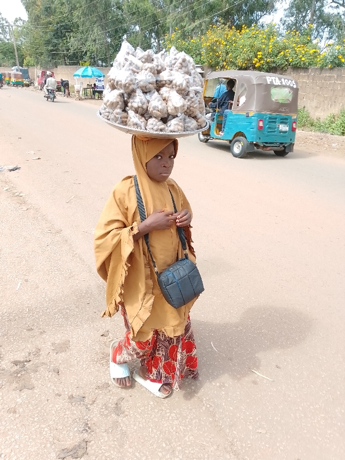 The image displays a young individual, likely a child, standing in the center of an asphalt road in Jos, Nigeria. The individual wears a light brown head covering (hijab), a matching light brown loose garment, and a red and white patterned skirt, with white slide sandals on their feet. A large, circular silver tray, stacked with numerous small, transparent plastic bags containing light-colored, possibly edible items (e.g., groundnuts), is balanced on their head. A dark blue, quilted cross-body bag is worn over their left shoulder. The individual's hands are clasped in front, and their gaze is directed towards the camera. In the mid-ground to the right, a light blue and brown three-wheeled commercial vehicle (keke Napep) with "PTA-1005" visible on its rear canopy is present on the road, partially obscured by the foreground subject. A person is visible within the vehicle. Further down the road to the left, additional vehicles, including another three-wheeled vehicle and a motorcycle with a rider, are visible, along with what appears to be a vendor's setup under a blue umbrella. Overhead utility wires traverse the scene. The background includes green trees, a concrete wall to the right, and a cluster of yellow flowering shrubs behind the wall. The road surface is worn asphalt, and the scene is illuminated by natural daylight.