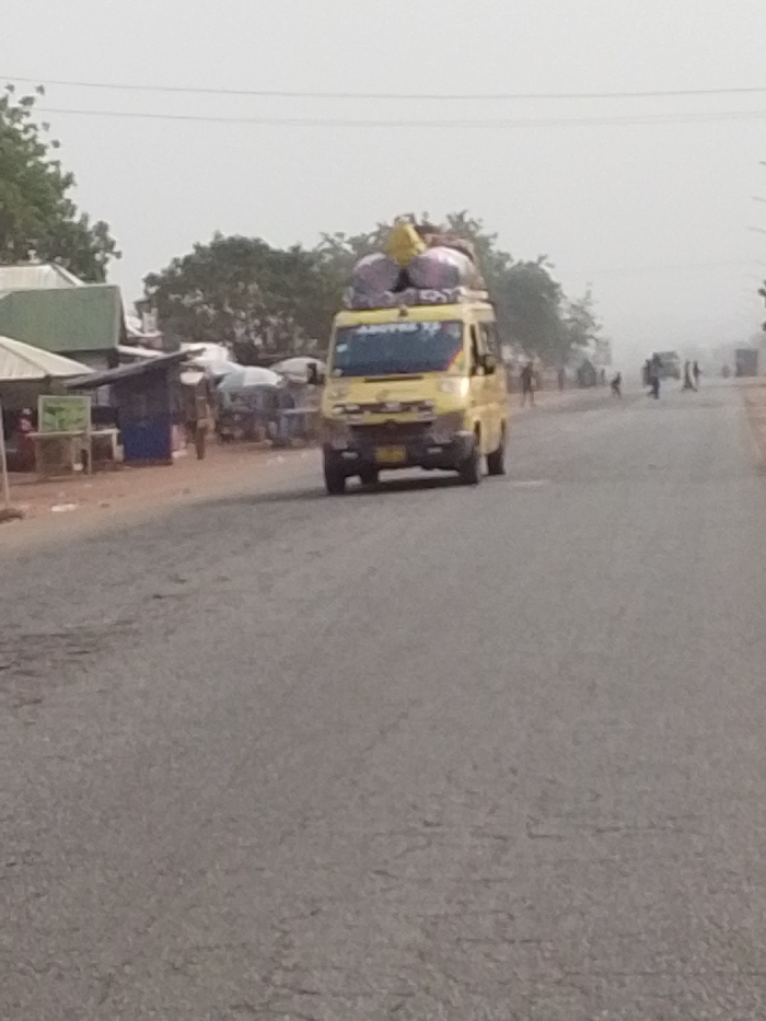 An undated daytime photograph depicts a yellow passenger van traveling on a paved two-lane road in Dungu, Ghana
