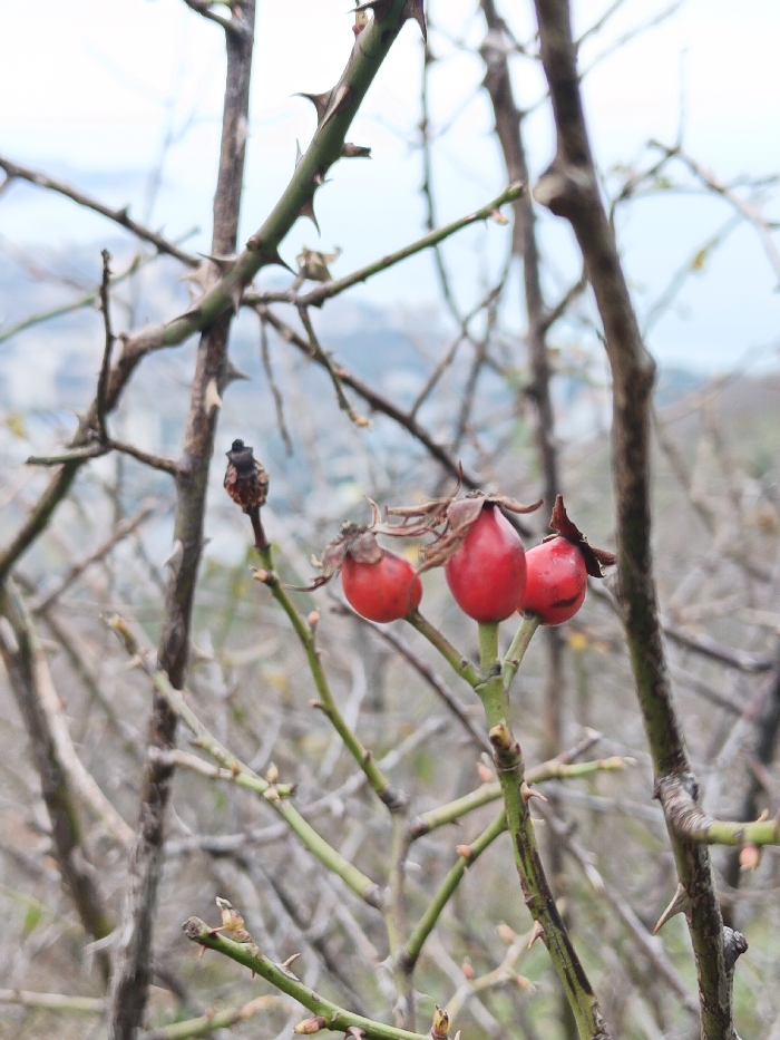 The image displays a close-up view of rose hips on thorny branches in the city of Partenit, Ukraine. In the central-right foreground, three bright red, ovoid rose hips are clustered on a slender, green-brown stem, each topped with remnants of dried calyces. To the left, a single, shriveled, dark brown rose hip is present on a separate, bare branch. Numerous bare, thorn-covered branches, ranging in color from dark brown to green-tinged, crisscross the frame, both in sharp focus in the foreground and blurred in the background, indicating a dormant or late autumn/winter state for the shrub. The background is significantly out of focus, revealing a distant landscape of muted green and brown hills or mountains beneath a light grey, overcast sky. Faint, indistinct architectural forms are discernible within the distant landscape, consistent with a populated area within the mountainous terrain surrounding Partenit. No individuals or specific actions are depicted.