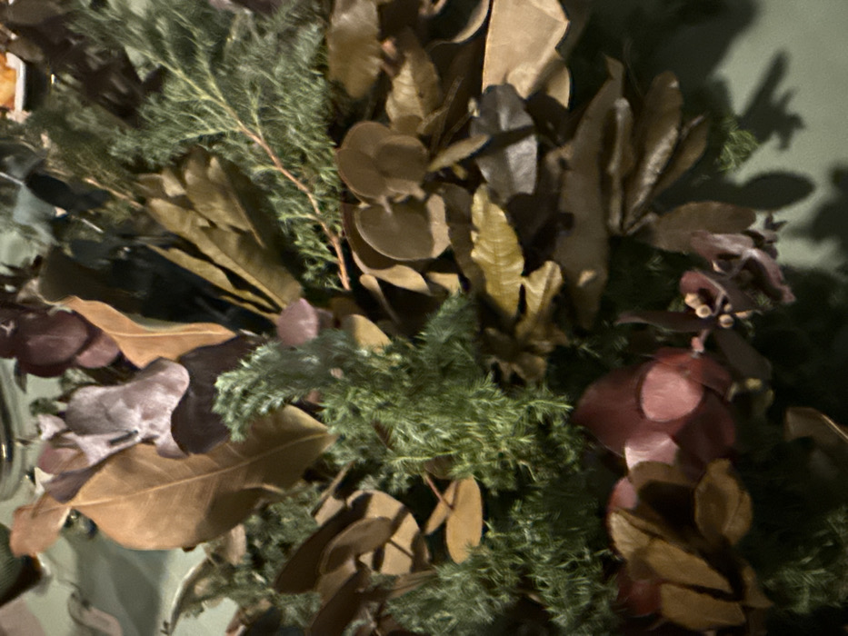 close-up of a holiday wreath or arrangement. There are various green evergreen sprigs, large, faded brown magnolia leaves, and circular eucalyptus leaves in shades of brown and green. Some leaves appear reddish-brown, possibly indicating berries or dried floral elements. The lighting is dim and casts shadows, making it difficult to discern all the details. The composition is dense with plant material, suggesting a full and textured wreath.