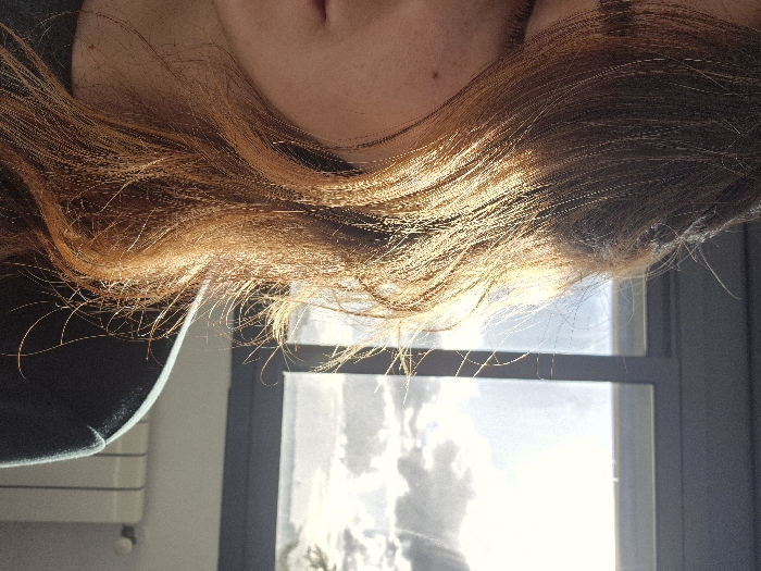 The image depicts the left profile of a person indoors in Tixeraïne, Algeria. The individual has long, wavy, reddish-brown hair, heavily illuminated by direct sunlight from a large window positioned to their right. The left eye is partially visible, appearing closed or directed downwards, with a small dark mark present on the cheek below the eye. The person is wearing a dark green long-sleeved garment. Beyond the dark-framed window, a bright sky with visible cloud formations is evident. A white, ribbed radiator is situated directly below the window on the right side of the frame.