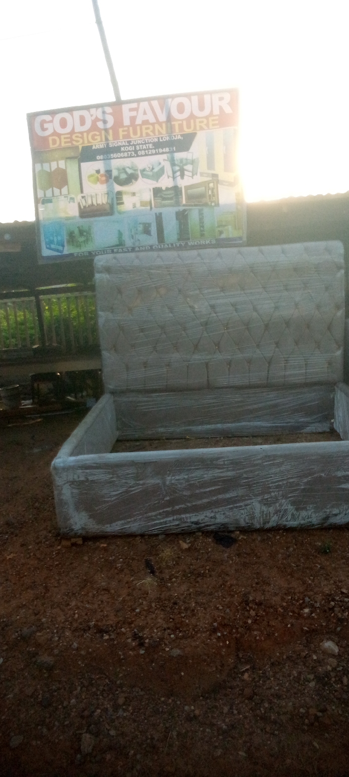 The image displays an outdoor scene at Army Signal Junction, Lokoja, Kogi State, Nigeria. A dissembled bed frame, consisting of a headboard and a rectangular base, occupies the foreground. Both components are upholstered in a light-colored fabric, with the headboard featuring a diamond-tufted design, and both are entirely encased in clear plastic wrap. The headboard stands upright, while the base lies flat on the reddish-brown, unpaved earth, which contains small stones and sparse dry vegetation. Directly above the bed frame, a prominent rectangular sign for "GOD'S FAVOUR DESIGN FURNITURE" is visible. The sign features images of various furniture items and clearly displays "ARMY SIGNAL JUNCTION LOKOJA, KOGI STATE" along with phone numbers and the slogan "FOR YOUR FAST AND QUALITY WORKS." In the background, behind the bed frame, a dark, obscured area shows what appears to be a metal fence or railing with some green foliage beyond it. The upper portion of the frame shows a bright, hazy sky. No individuals are present in the scene.