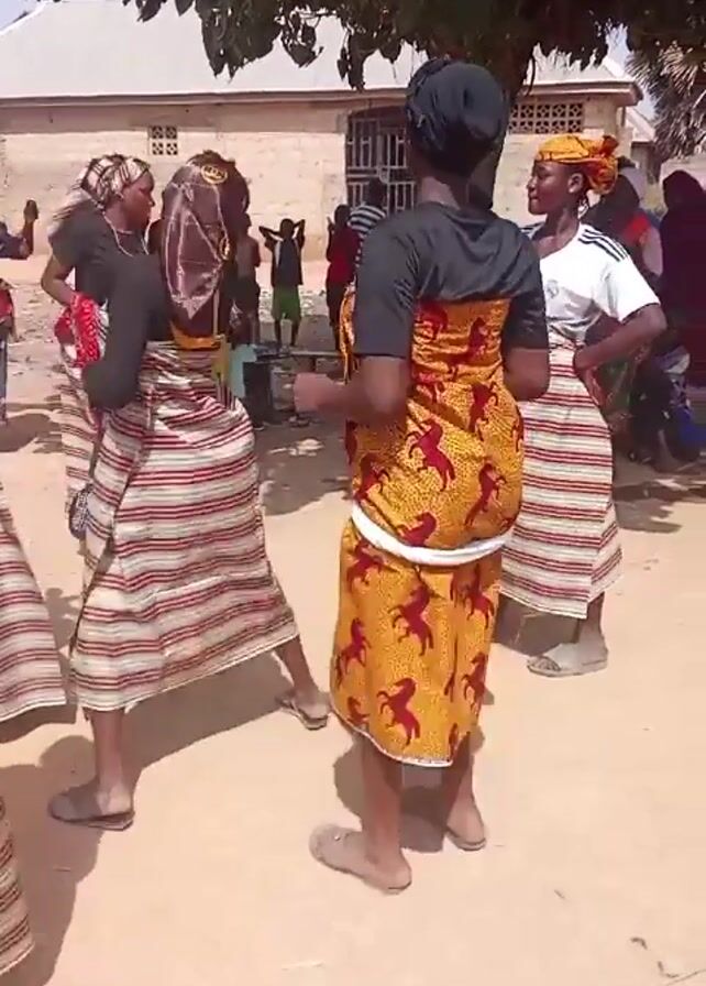 group of African women dancing outside on a sunny day. The women are dressed in colorful skirts, shirts, and headwraps. The person filming is wearing a colorful patterned skirt and a pink headwrap. She turns toward the camera, smiles, and laughs, then turns back to the group. The dance is happening on a sandy surface under a large tree. In the background is a pale brick building with a white roof. Other people are standing in the background, some wearing traditional clothing. The music is loud and rhythmic.