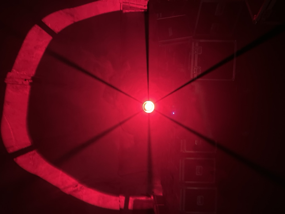 The image depicts an indoor environment in Rostov-on-Don, Russia, characterized by strong red illumination. A prominent, bright red light fixture is centrally positioned, emitting multiple distinct light rays that fan out across a dark background, indicative of light scattering through atmospheric haze or fog. Above this central light, a large, semi-circular arch structure, appearing segmented and composed of a light-colored, possibly fabric-wrapped material, is illuminated. Below the central light, on a dark floor surface, several dark, rectangular objects consistent with road cases or equipment boxes are arranged. The scene is devoid of individuals or observable actions.
