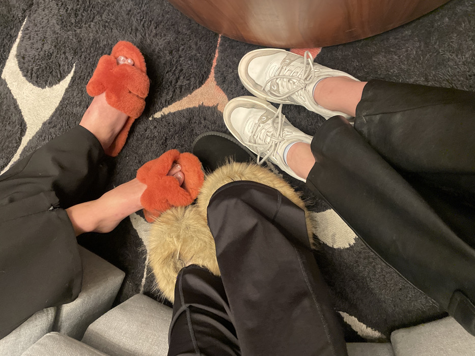 Three pairs of feet are gathered on a patterned rug. One person wears orange, fluffy slippers. Another has on white sneakers with light blue socks. The third individual is wearing black shoes with a fur-lined coat or jacket draped over their lap. All three figures are wearing black pants and sitting on a gray couch. The edge of a round wooden coffee table is visible in the top right corner.