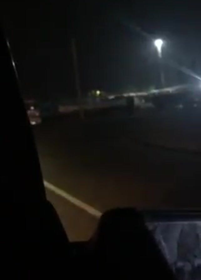 view from inside a car driving at night. The road is visible, with a white line marking the lane. There are buildings and trees on the side of the road, illuminated by streetlights. A few cars or trucks pass by in the distance. The camera appears to be handheld and shaky. The overall atmosphere is dark and slightly blurry.