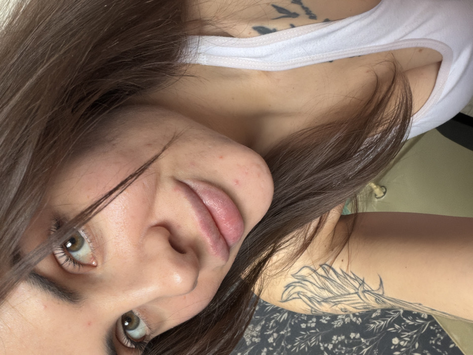 A woman with brown hair and hazel eyes looks at the camera. She wears a white tank top. Tattoos are visible on her upper chest and left arm. The background appears to be a dark floral patterned fabric. The angle is from slightly above her.