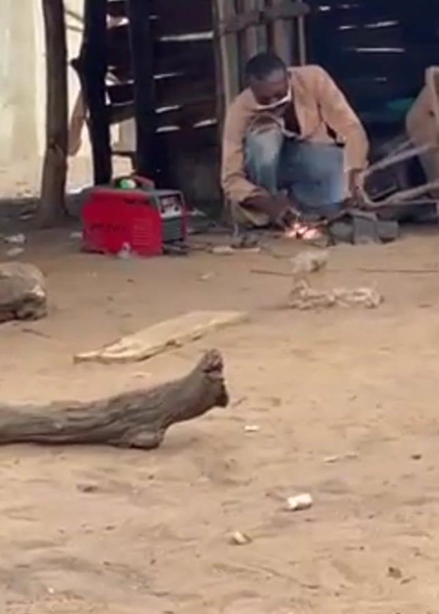 man squatting in front of a workshop, apparently welding metal. He is wearing jeans and a light brown shirt, along with eye protection. The workshop is a crude, wooden structure. A red welding machine sits to the left of the man. The ground is sand. After welding, the man picks up an object.