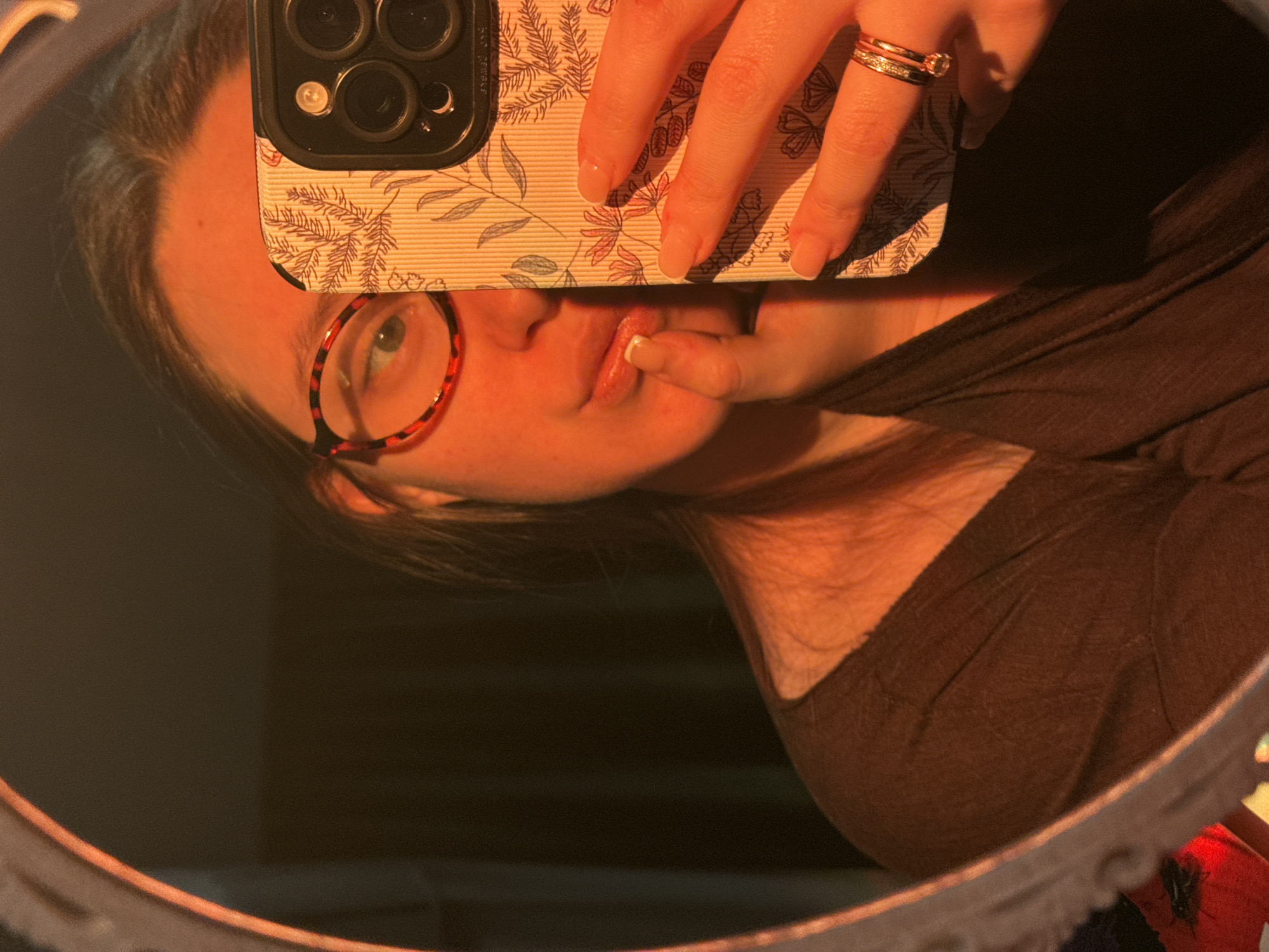 A person is taking a selfie in a mirror, with warm lighting reflecting off their face and the mirror itself. The person wears glasses with a tortoise-shell frame and has a ring on one of their fingers holding the phone. The phone case has a floral pattern. The person is wearing a brown shirt. The location is unknown and the information about Krasnodar, Russia is not applicable.