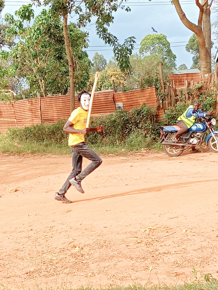 This image depicts an outdoor scene on an unpaved dirt road in Lumakanda ward, Kenya, under daylight conditions. In the foreground, a dark-skinned individual, likely male, is captured in mid-stride, running or hopping towards the left of the frame. This individual wears a plain white facial mask, a yellow short-sleeved t-shirt with a faint dark mark resembling a 'B' on the chest, dark trousers, and athletic shoes. Both hands hold a long, light-colored wooden stick or pole vertically. To the right, in the midground, a male individual with dark skin and short dark hair is seated on a blue motorcycle. He wears a light blue long-sleeved shirt and a bright yellow high-visibility vest, looking towards the camera with a slight smile. The motorcycle has a black seat and silver components. Behind the individuals, a fence constructed from rusted, reddish-brown corrugated metal sheets is partially obscured by green bushes and dense green foliage. Numerous trees with green leaves populate the background, extending towards the upper frame. The sky above is light blue with some cloud cover. A dark bird is visible in flight in the upper background, positioned above the trees. The ground is a dry, reddish-brown dirt surface.