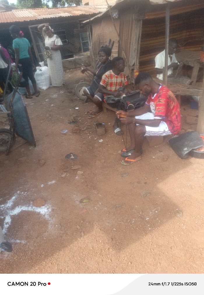 This image depicts an outdoor scene in Markurdi, Nigeria, characterized by an unpaved, reddish-brown dirt ground. The foreground displays scattered white powdery substance, forming an incomplete circular shape. Multiple individuals are present amidst makeshift structures. To the far left, a person in a teal t-shirt stands near a dark wheelbarrow. Adjacent to them, a woman in a long white dress stands, holding a light-colored bag and appearing to adjust her hair. Large white sacks are visible behind her. Towards the center-right, a group of people is seated near a corrugated metal structure, likely a small shop or stall. A woman in a dark top and shorts is seated on what appears to be a stool or a portion of a cart frame. Next to her, a man in a red and plaid shirt sits on a wooden bench, looking left. In the foreground, another young man, wearing a red tie-dye t-shirt and white shorts, is seated, intently working on a dark object, possibly footwear, using a black string or lace. He wears orange flip-flops. A black bag and a small wooden box are on the ground near him. Inside the corrugated metal structure, an older man in a white shirt is seated at a wooden table or workbench, engaged in an activity. The structures feature corrugated metal roofs and walls, with one building having a screened window.