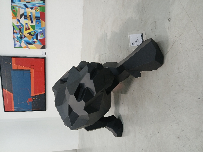 The image showcases a black, geometric sculpture on a light gray floor, seemingly an art piece in an exhibition. The sculpture features sharp angles and a polygonal design. Two framed artworks hang on the white wall behind it; one displays colorful abstract shapes, while the other contains geometric forms in red, blue, black, and gray. A small information card is partially visible near the sculpture. The lighting in the scene is bright and even.