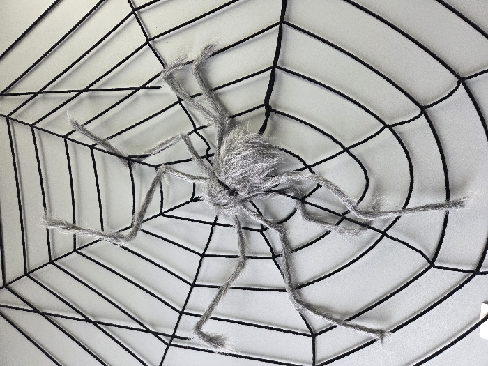 The image displays a large, artificial spider and spiderweb against a plain, light-colored background