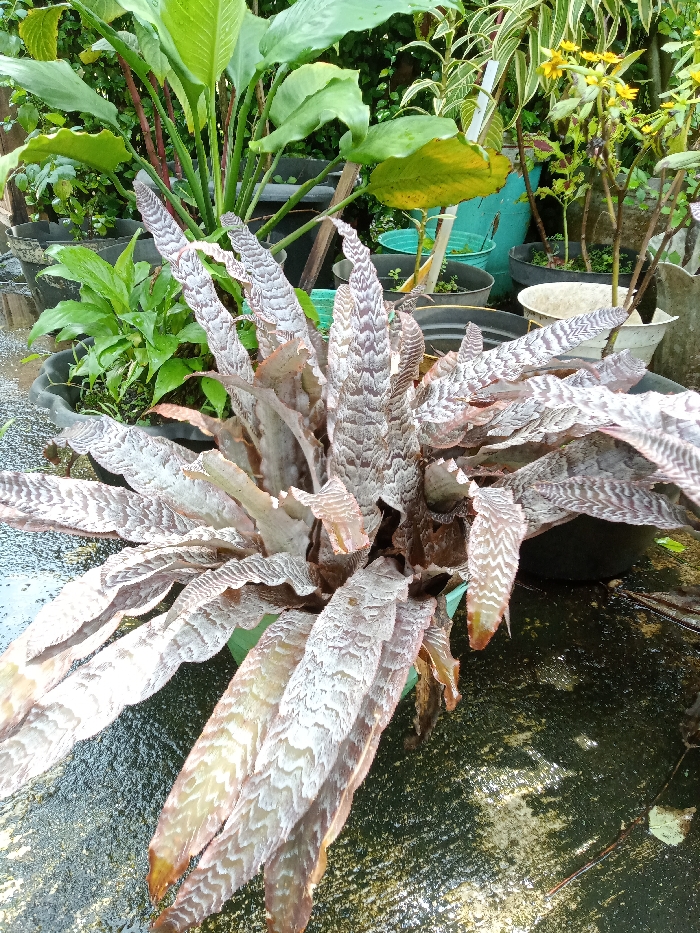 A bird's-eye view of a potted Cryptanthus plant, prominently displayed in the foreground, features variegated foliage with intricate patterns of white and brown. Surrounding the Cryptanthus are other potted plants, including a peace lily with its large, glossy green leaves and a collection of various plants in different stages of growth. The pots are arrayed on a damp, concrete surface, hinting at a garden setting.