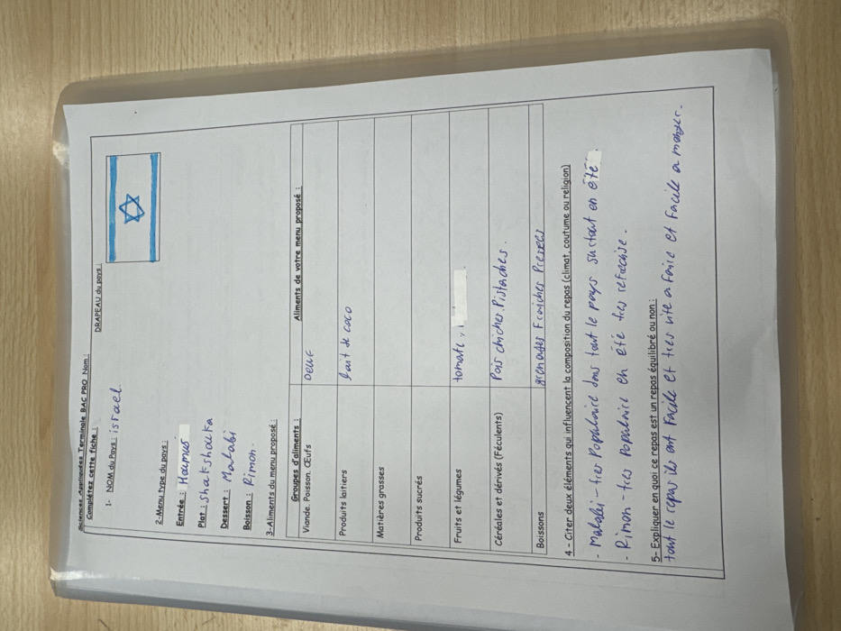 A white paper document, identified as a "Sciences Appliquées Terminale BAC PRO" worksheet, is enclosed within a clear plastic folder and rests on a light brown wooden surface in Schiltigheim, France. The document is handwritten in blue ink. It details information about Israel, including its name "Israel" and a hand-drawn flag of Israel with two horizontal blue stripes and a central blue Star of David. A proposed menu lists "Hummus" (appetizer), "Shakshouka" (main course), "Malabi" (dessert), and "Rimon" (drink). A table categorizes menu items by food group, including "Oeuf" (egg), "lait de coco" (coconut milk), "tomate" (tomato), "Pois chiches. Pistaches." (chickpeas, pistachios), and "grenades Fraiches Presees" (fresh pressed pomegranates). Handwritten responses indicate that Malabi and Rimon are popular in summer due to the climate, and describe the meal as "Facile et tres vite a faire et Facile a manger" (easy and very quick to make and easy to eat).