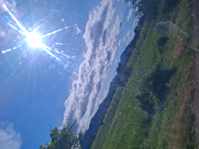 A tilted landscape photograph captures a sunlit rural scene in the city of Tudun Wada, Nigeria. The upper right quadrant is dominated by a brilliant sun, exhibiting prominent lens flare and distinct sunburst rays against a clear blue sky with scattered white cumulus clouds. The lower two-thirds of the image feature a sloping, verdant hillside covered in dense green grass and various shrubs, indicating lush vegetation. A range of distant mountains or large hills, appearing dark blue-green, spans the background from left to right. The bottom edge of the frame reveals patches of exposed brown earth. A leafy tree branch from an unseen tree partially enters the frame from the upper left. No human subjects, animals, or artificial structures are visible. The scene is brightly illuminated by direct sunlight.