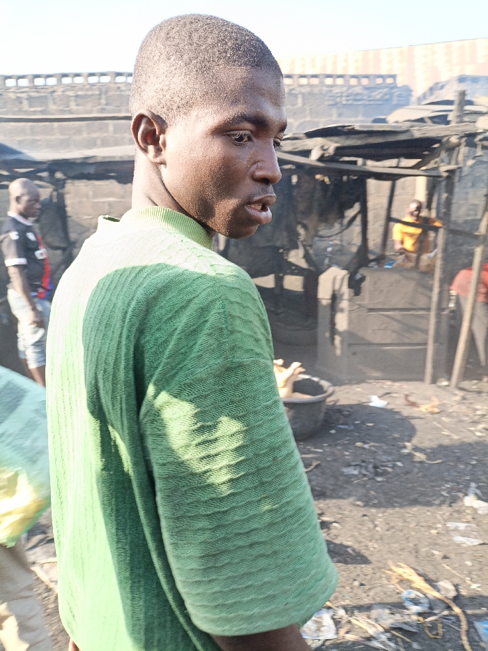 The image depicts an outdoor scene in Fagge D2, Nigeria, under direct sunlight. In the foreground, a dark-skinned male with a closely shaved head and a light-green, ribbed long-sleeved shirt is shown in profile, looking towards the right side of the frame with his mouth slightly open. His right shoulder and arm are visible, with distinct shadows cast by the sunlight. In the midground, behind the foreground subject, several rudimentary structures made of dark, possibly charred wood and corrugated metal are present, indicating a state of disrepair or post-fire damage. To the left, a second dark-skinned male is partially visible, wearing a dark t-shirt with red and white elements and light-colored shorts. Further into the background, within the dilapidated structures, a third individual in a bright orange shirt is dimly discernible, positioned near what appears to be a counter or workstation. A dark bucket is on the ground near the center-right, containing light-colored material. The ground throughout the visible area is uneven, dusty, and covered with scattered debris, including small pieces of paper and organic matter. In the distant background, a taller, light-colored wall or structure is visible under a clear sky.